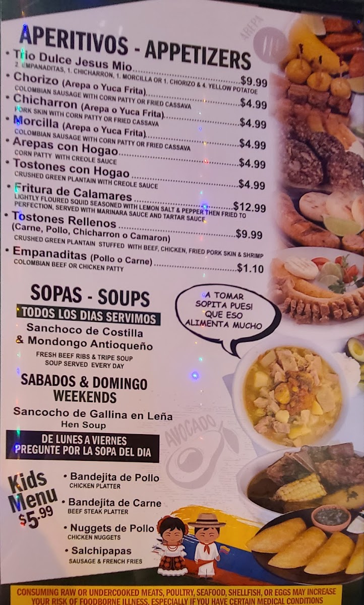The menu also highlights traditional Colombian specialties such as Bandeja Paisa, Empanadas, Sancocho De Costilla, and Tostones, representing the local cuisine. Complementing the food menu, a variety of beverages are available including Tequila, Red Wine, Vodka, and cocktails like Moscow Mule.
